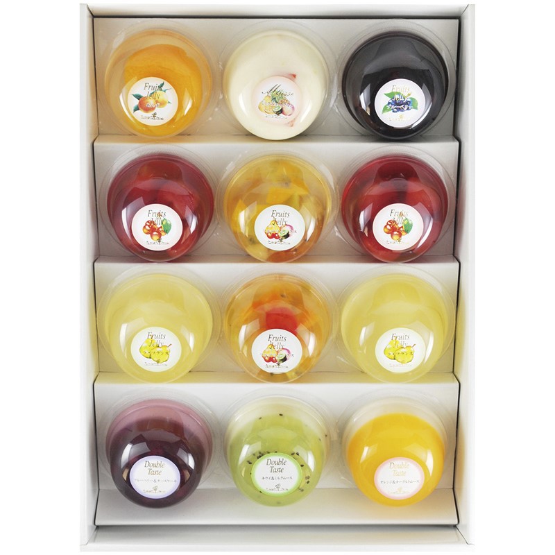 フルーツゼリー(フルーツミックス・ラフランス・さくらんぼ)(各95g)×各2、フルーツゼリー(ブルーベリー)・ダブルテイスト(ブルーベリー&チーズケーキ・キウイ&ミルクムース・オレンジ&ヨーグルトムース)(各95g)・フルーツゼリー(あんず・ミックスヨーグルトムース)(各90g)×各1