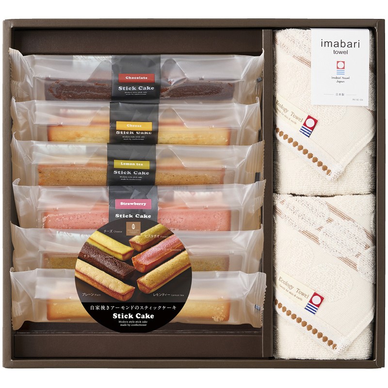 フェイスタオル(34×80cm)×2、スティックケーキ(プレーン・チョコ・チーズ・レモンティー・ストロベリー・ピスタチオ)×各1