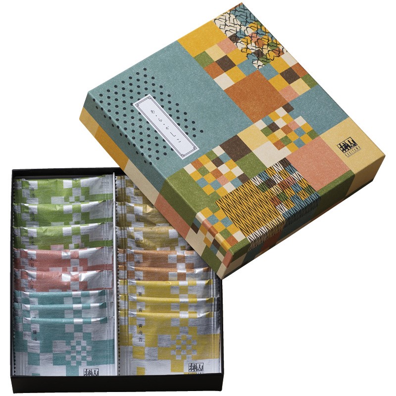 伝統工芸・寄木細工をアレンジしたモダンでカラフルなパッケージは、カジュアルながらも高級感があり、様ーな手土産に最適です。中には一口サイズのおかきを6種類詰合せました。
