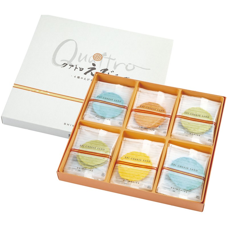 クアトロ(QUATTRO)とは、イタリア語で「4」を表す言葉。志満秀オリジナルの4種のチーズクリームをえびせんべいでサンド。例えばモッツァレラとバジル、ブルーチーズと蜂蜜はイタリア料理でおなじみのコンビ。お気に入りのワインのおともに、またパーティやお茶会など様ーなシーンでお楽しみいただけます。