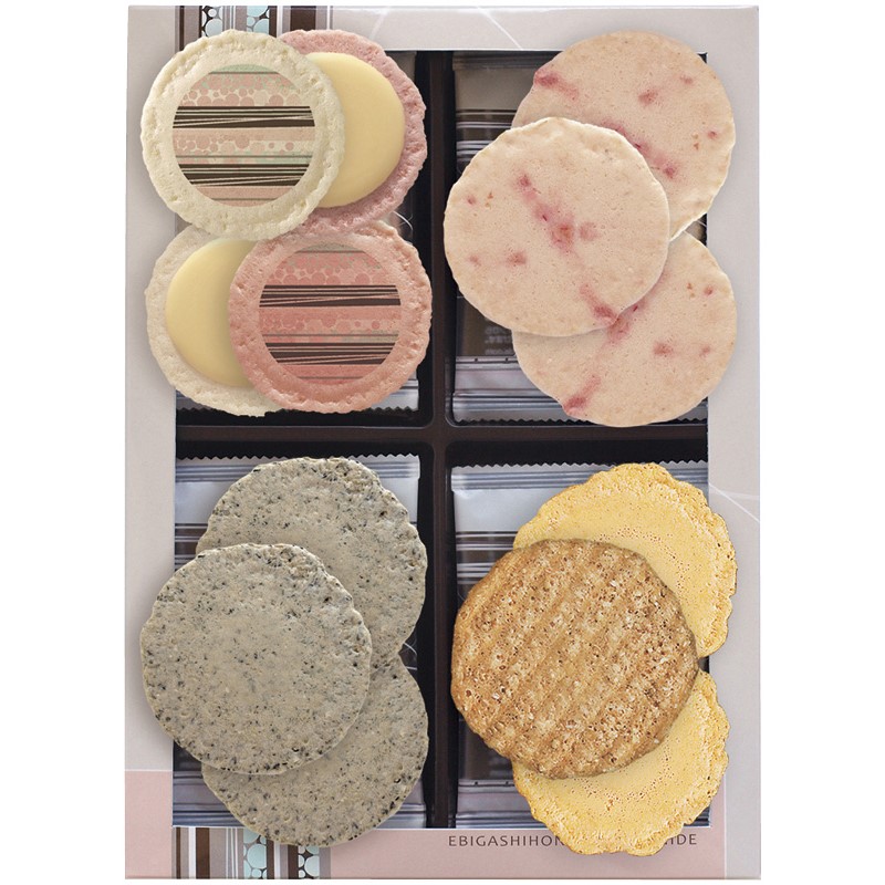 えび煎餅(黒ごま・紅生姜)×各3、紅白せんべいチーズサンド・ふた焼ごま・えび柚子胡椒×各2