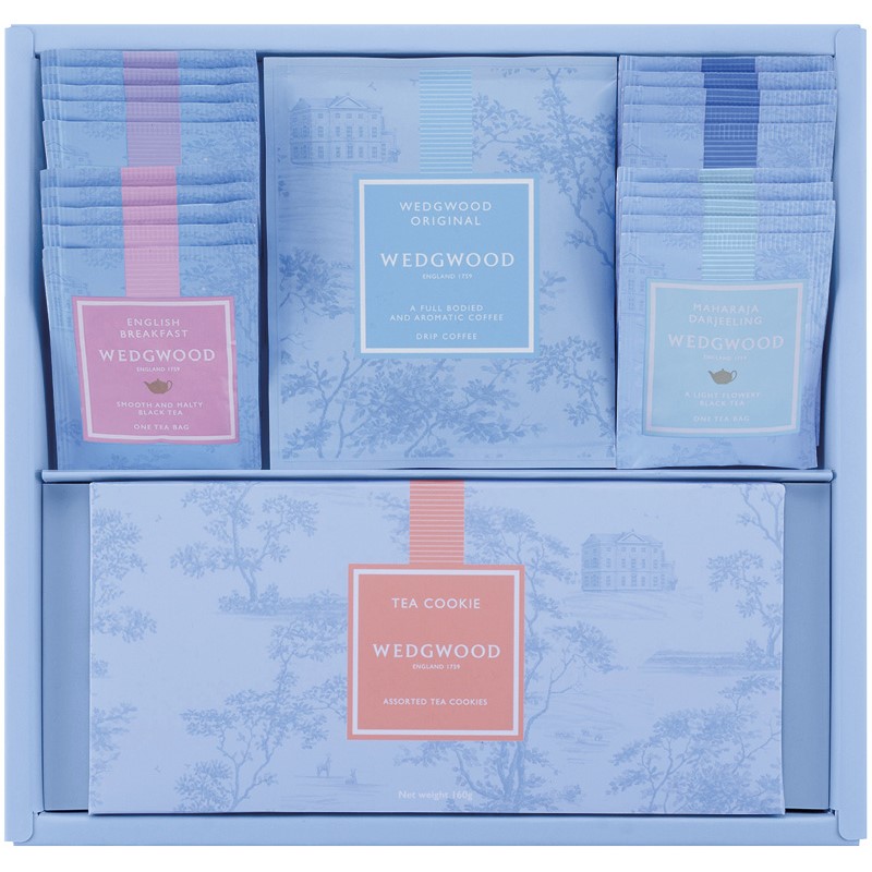 イングリッシュ ブレックファスト・アールグレイ・ウェッジウッドオリジナル・マハラジャダージリン(各2g)×各5、オリジナルドリップコーヒー(10g)×3、ティークッキーアソート(アップル・レモン)(各80g)×各1