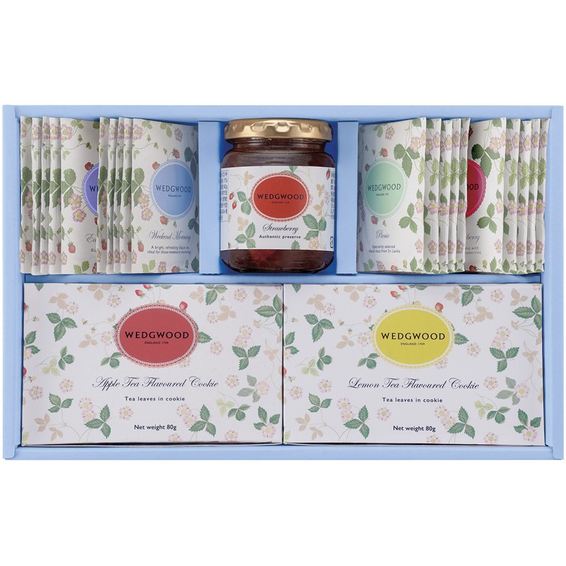 ウェッジウッドの代表柄「ワイルド ストロベリー」の可愛らしいパッケージに包まれた紅茶、ジャム、茶葉入りクッキーのアソートセット。ウェッジウッドの味わいで気軽にティータイムを楽しめる為、紅茶好きの方へお勧めです。