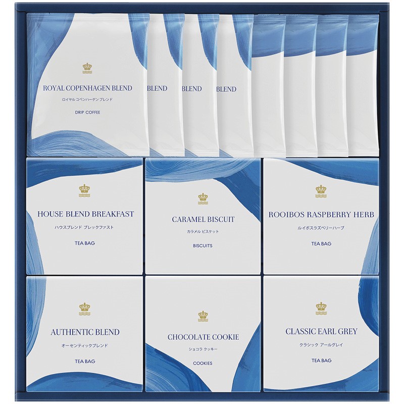 ハウスブレンド・オーセンティックブレンド・クラシックアールグレイ・ルイボスラズベリーハーブ(各2.5g)×各5、ドリップコーヒー(ブレンド・カサブランカ)(各10g)×各4、カラメルビスケット(65g)・ショコラクッキー(40g)×各1