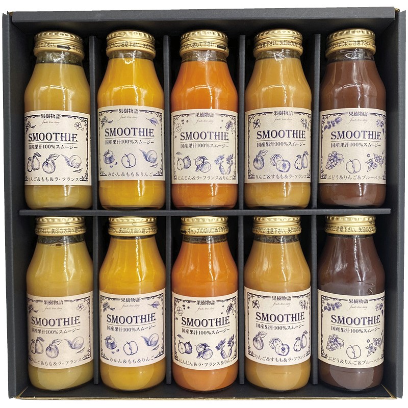 1本に3種類の国産素材を使用したストレート果汁・野菜汁100%のフルーツスムージー。 本物の味を知る果物農家がみずから選んだ素材そのままの味を独自のノウハウでとじこめました。