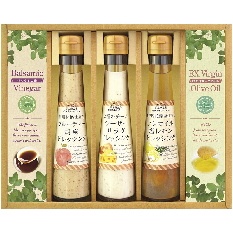 ドレッシング(信州林檎仕立てフルーティー胡麻・2種のイタリアンチーズシーザーサラダ)・瀬戸内花藻塩仕立てノンオイル塩レモンドレッシング(各120ml)・エクストラバージンオリーブオイル(8g×5p)・バルサミコ酢(3.3ml×5p)×各1