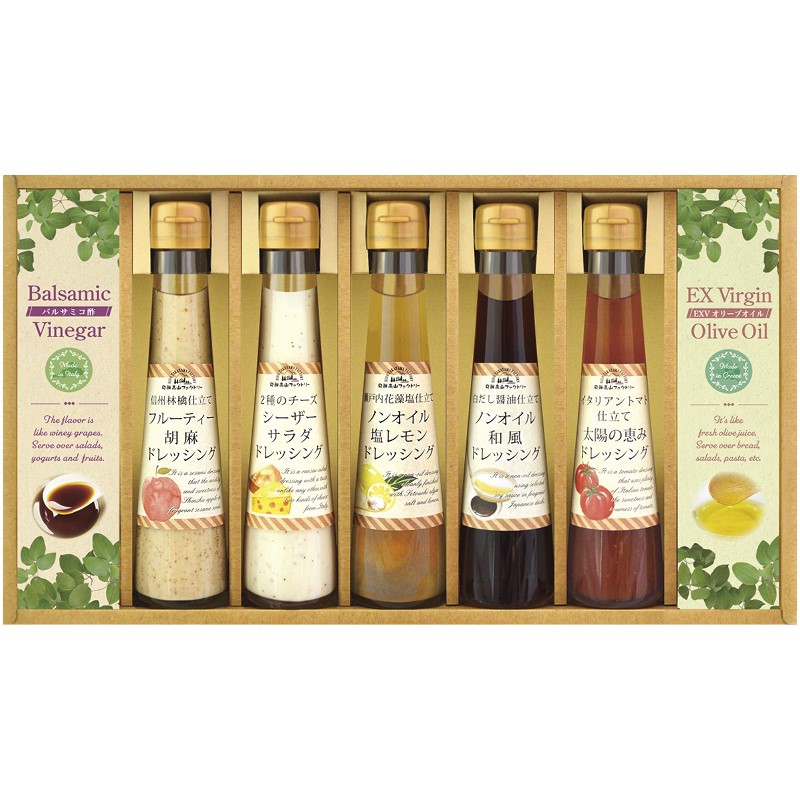 ドレッシング(信州林檎仕立てフルーティー胡麻・2種のイタリアンチーズシーザーサラダ・イタリアントマト仕立て太陽の恵み)・瀬戸内花藻塩仕立てノンオイル塩レモンドレッシング・白だし醤油仕立てノンオイル和風ドレッシング(各120ml)・エクストラバージンオリーブオイル(8g×5p)・バルサミコ酢(3.3ml×5p)×各1