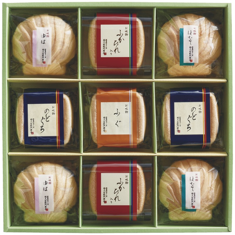 鰹節専門店ならではの、だし薫る風味豊かなお吸物です。のどぐろ、ほたてなどを椀種にしたそれぞれのお吸物を、香ばしい手焼きの最中に包みました。お湯を注ぐだけで、料亭さながらの味をお楽しみいただけます。