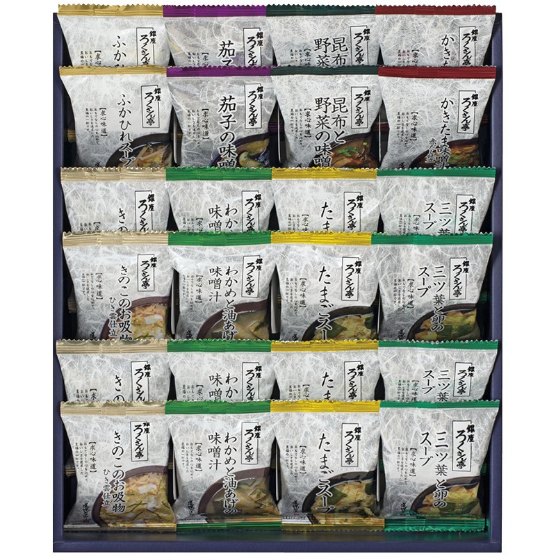 三ツ葉と卵のスープ・たまごスープ・きのこのお吸物ひき雲仕立・わかめと油あげの味噌汁×各4、かきたま味噌汁赤だし仕立・ふかひれスープ・昆布と野菜の味噌汁・茄子の味噌汁×各2