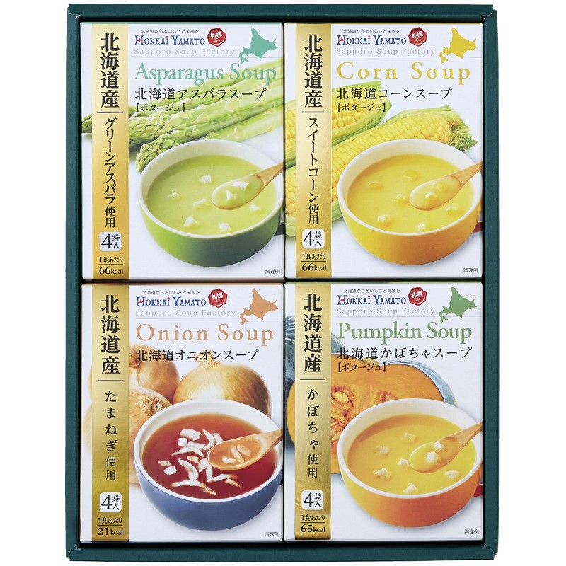 北海道産素材を活かした4種類のスープ(16食分)の詰合せです。 北海道の大地で育ったアスパラガスをはじめスイートコーンや玉ねぎなどバラエティ豊かなスープコレクションです。