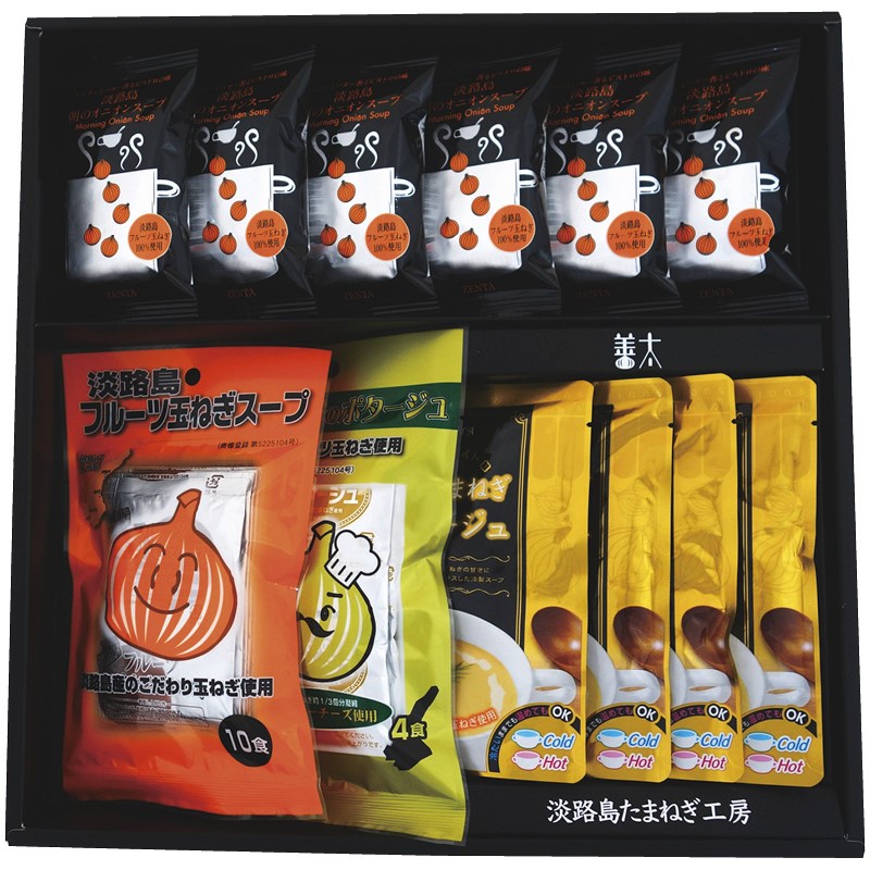 淡路島朝のオニオンスープ個食(7.9g)×6、金のたまねぎポタージュ(150g)×4、ZENTAの金のポタージュ(18.7g×4袋)・淡路島フルーツ玉ねぎスープ(6.2g×10袋)×各1