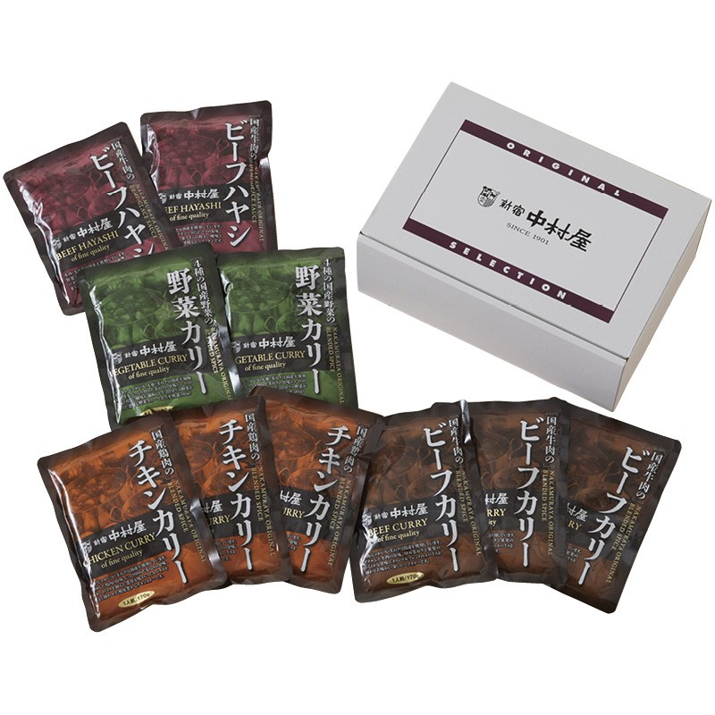 国産牛肉のビーフカリー・国産鶏肉のチキンカリー(各170g)×各3、4種の国産野菜の野菜カリー・国産牛肉のビーフハヤシ(各170g)×各2