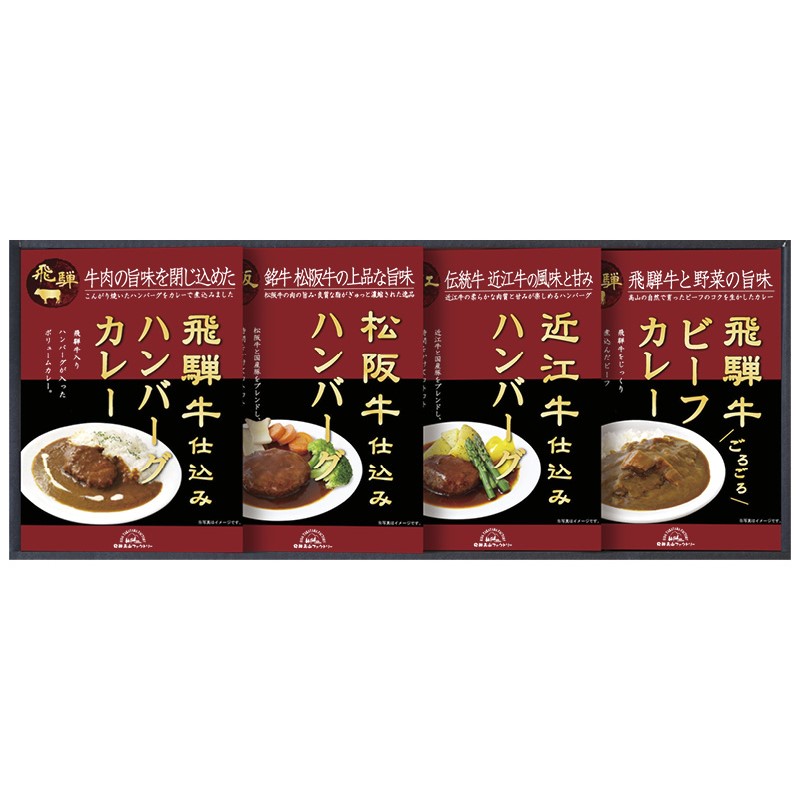 飛騨牛ビーフカレー・飛騨牛入りハンバーグカレー(各190g)・松阪牛仕込みハンバーグ・近江牛仕込みハンバーグ(各150g)×各1