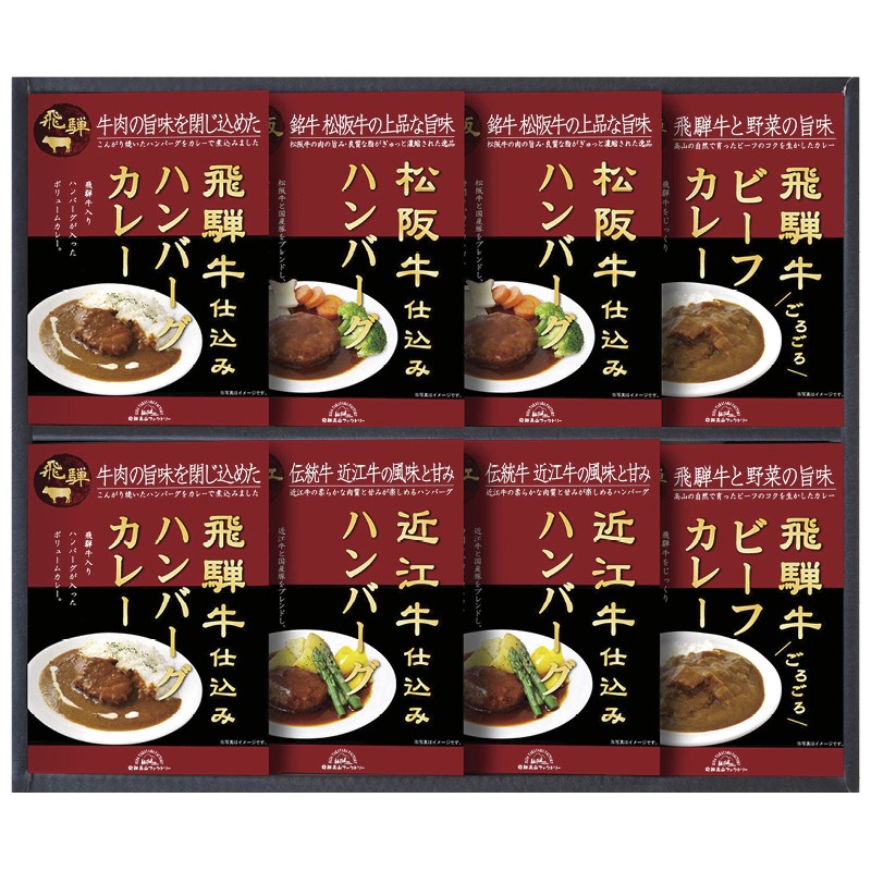 飛騨牛ビーフカレー・飛騨牛入りハンバーグカレー(各190g)・松阪牛仕込みハンバーグ・近江牛仕込みハンバーグ(各150g)×各2