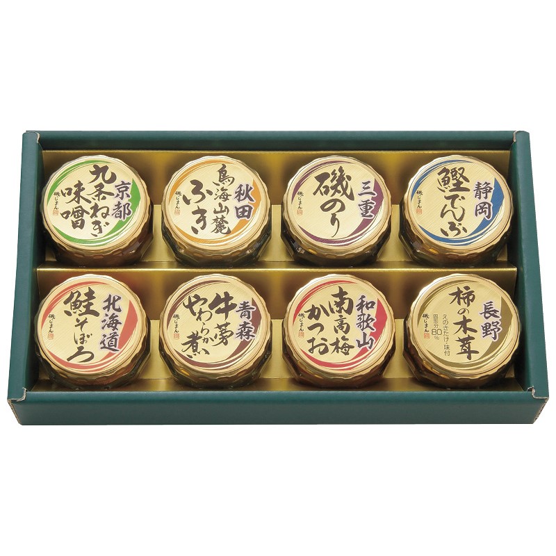 京都九条ねぎ味噌・三重磯のり・和歌山南高梅かつお(各90g)・長野柿の木茸(85g)・青森牛蒡やわらか煮(55g)・秋田鳥海山麓ふき・静岡鰹でんぶ(各45g)・北海道鮭そぼろ(40g)×各1