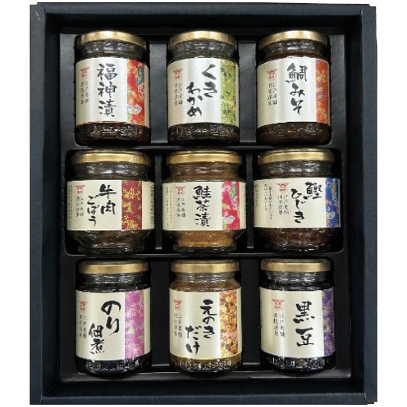 鯛みそ・黒豆(各100g)・のり佃煮(95g)・福神漬・えのきだけ(各90g)・くきわかめ(75g)・鮭茶漬(60g)・牛肉ごぼう(55g)・鰹ひじき(40g)×各1