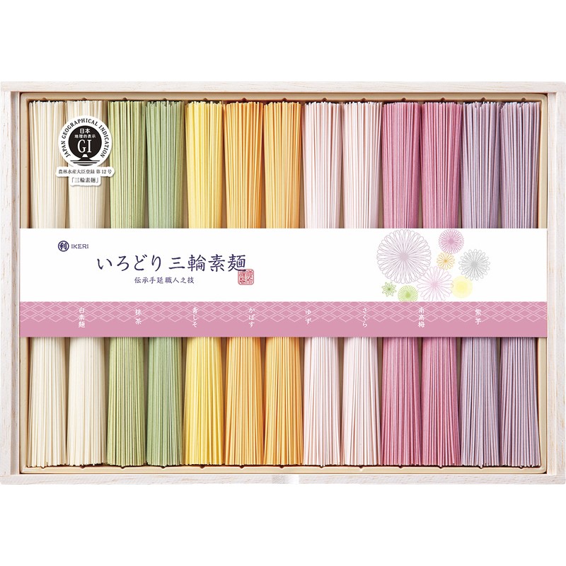 彩り三輪そうめんは特に女性へ向けた商品として作られております。キレイな花を買ってリビングに飾ることで気分がリラックスするように、様ーな色合いを贈り物で使ってもらい味や香りを楽しんでもらいたい素麺です。
