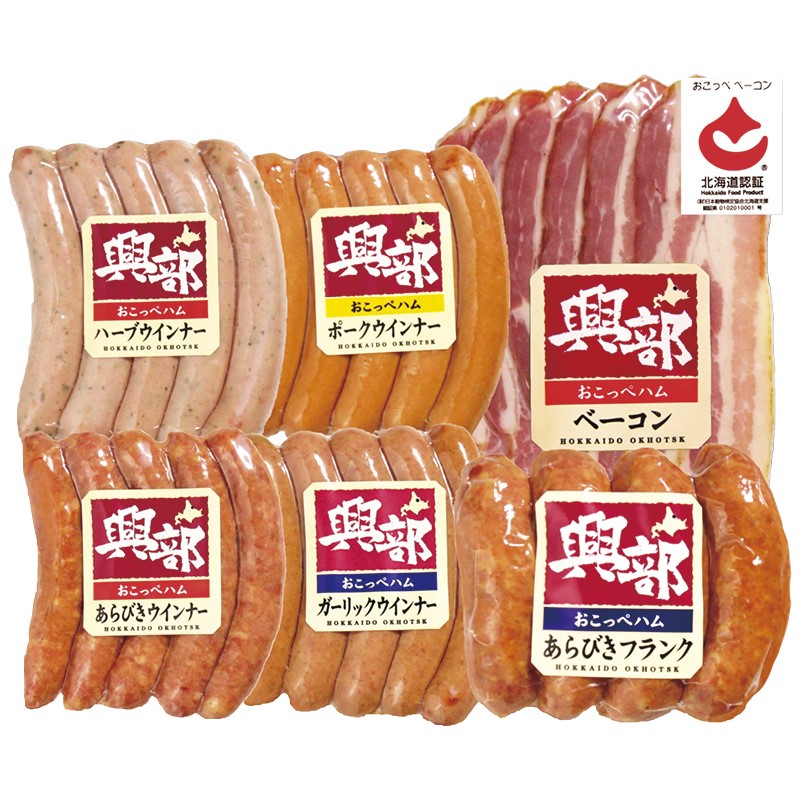 あらびきフランク(200g)・ハーブウインナー(135g)・ポークウインナー(120g)・あらびきウインナー・ガーリックウインナー(各110g)・北海道認証ベーコンスライス(80g)×各1