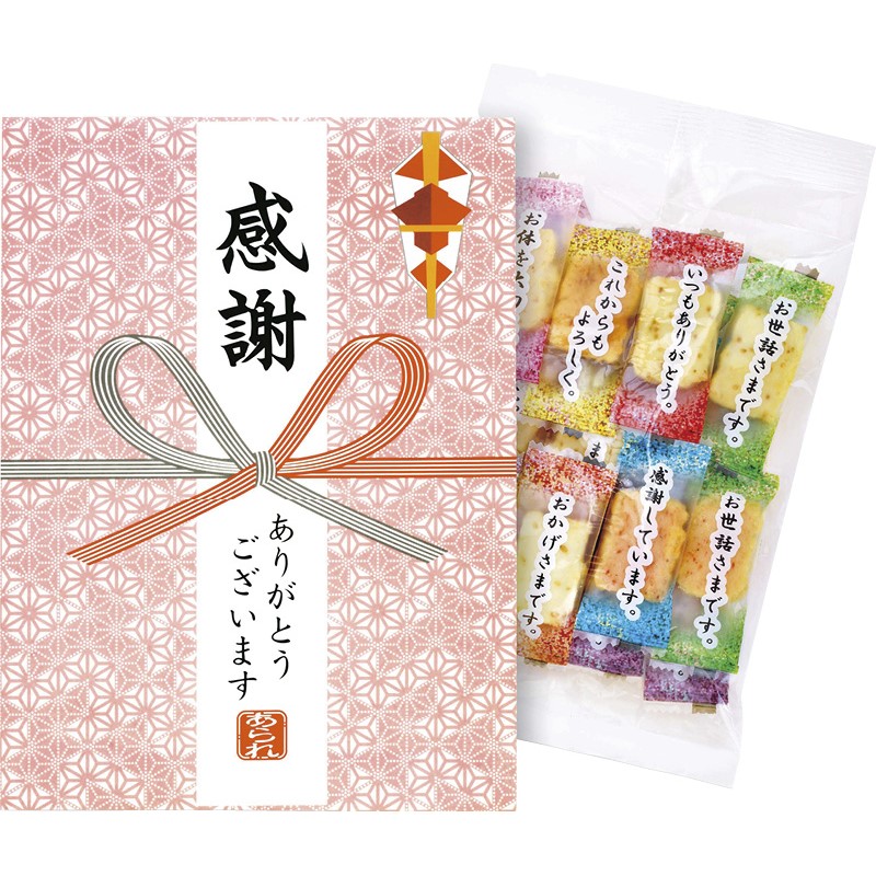 普段言葉にできない「ありがとう」の気持ちを個包装にデザインしたコメント入りのあられです。