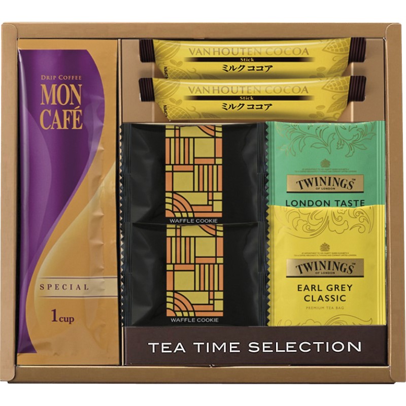 バンホーテン ミルクココア(18g)・クッキー・モンカフェ ドリップコーヒー スペシャルブレンド(7.5g)×各2、トワイニングティー(アールグレイクラシック・ロンドンテイスト)(各2.3g)×各1