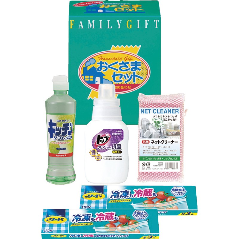 リード冷凍も冷蔵も新鮮保存バッグ(タイ)(S3枚)×2、ライオントップクリアリキッド抗菌(300g)・キッチンリフレッシュコンパクト(270ml)・ネットクリーナー(中国)×各1