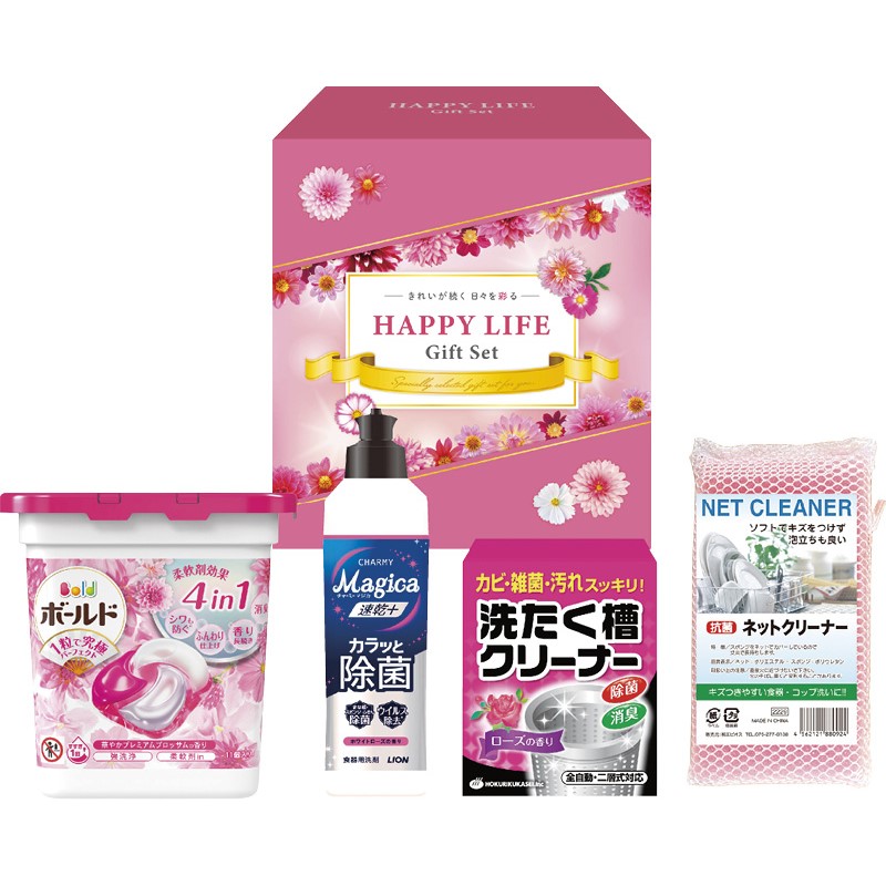 P&Gボールドジェルボール4D(11個)・ライオンチャーミーマジカ速乾+(プラス)カラッと除菌 ホワイトローズの香り(220ml)・洗濯槽クリーナーローズの香り(50g×2包入)・ネットクリーナー(中国)×各1