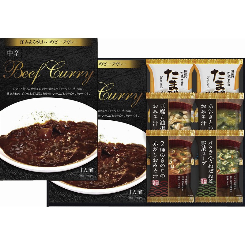 ビーフカレー中辛(180g)・たまごスープ(6.4g)×各2、豆腐と油揚げのおみそ汁(9.2g)・2種のきのこの赤だしおみそ汁(7.1g)・あおさとわかめのおみそ汁(6g)・オクラ入りねばねば野菜スープ(5.8g)×各1
