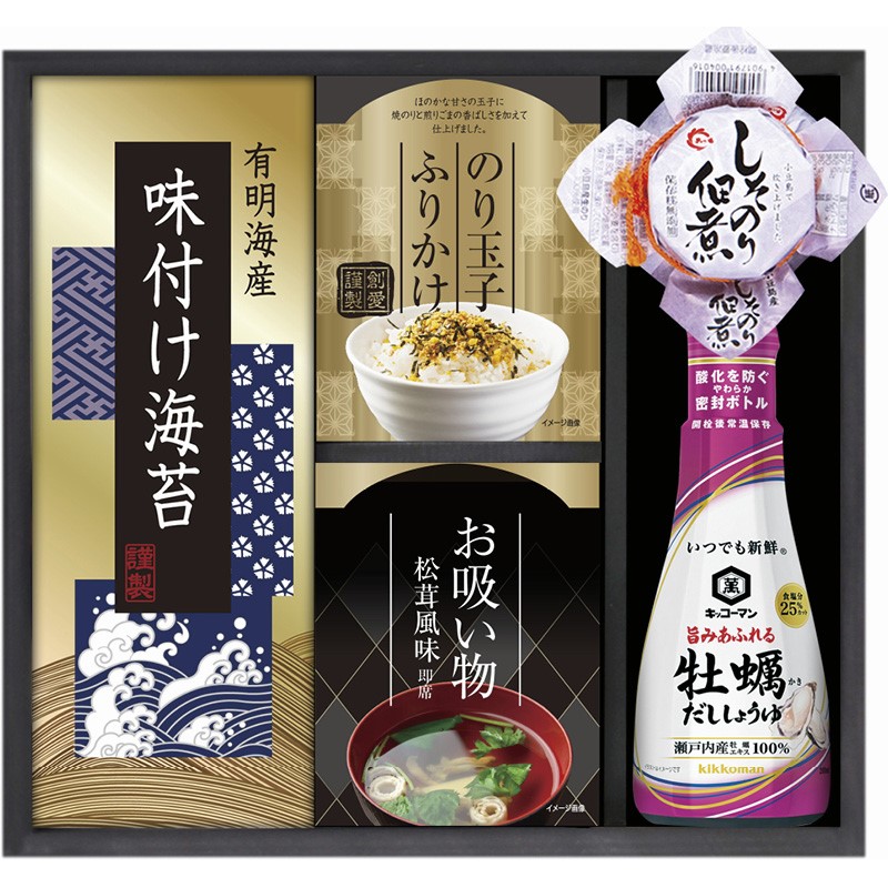 キッコーマン牡蠣だししょうゆ(200ml)・島の香しそのり佃煮(80g)・のり玉子ふりかけ(4.5g×2袋)・永谷園お吸いもの松茸風味(2.3g×4袋)・有明海産味付海苔(3切6枚)×各1