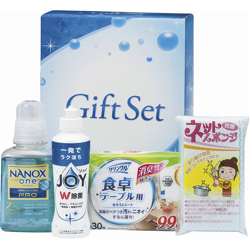 ライオンナノックスone PRO(380g)・P&G除菌ジョイコンパクト(170ml)・クリンクル食卓テーブル用シート(30枚入)・ネットスポンジ(中国)×各1