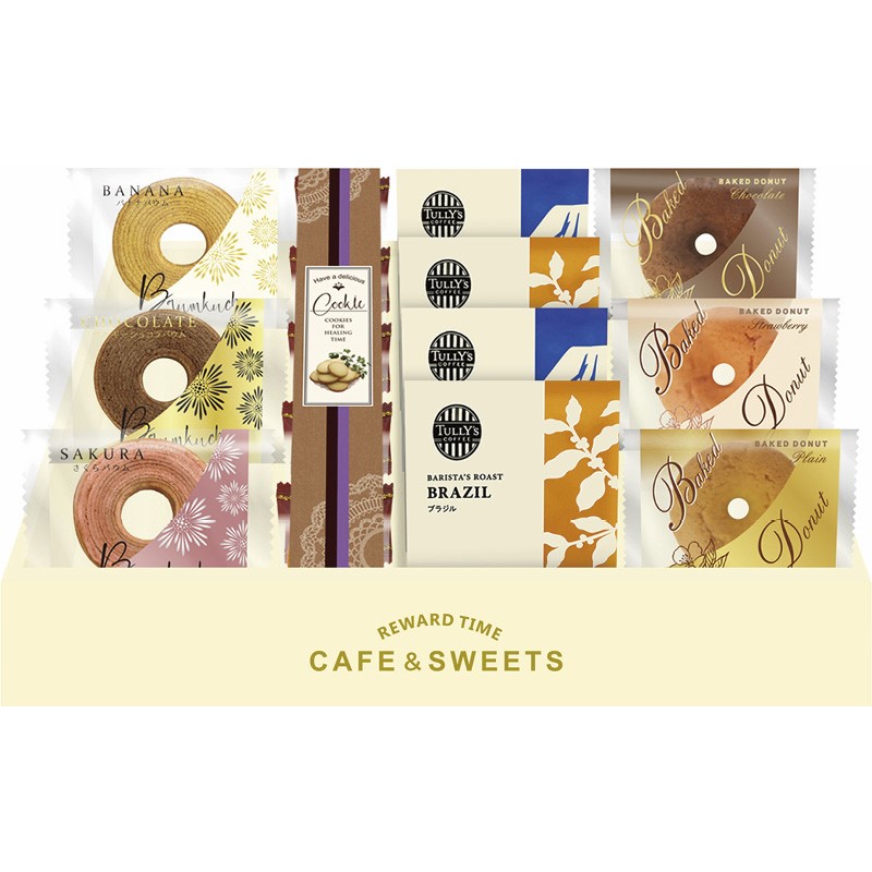 プレーンクッキー×5、タリーズドリップコーヒー(ブラジル・キリマンジャロ)×各2、ミニバウムクーヘン(バナナ・桜・ベルギーショコラ)・ベイクドドーナツ(プレーン・ストロベリー・ショコラ)×各1