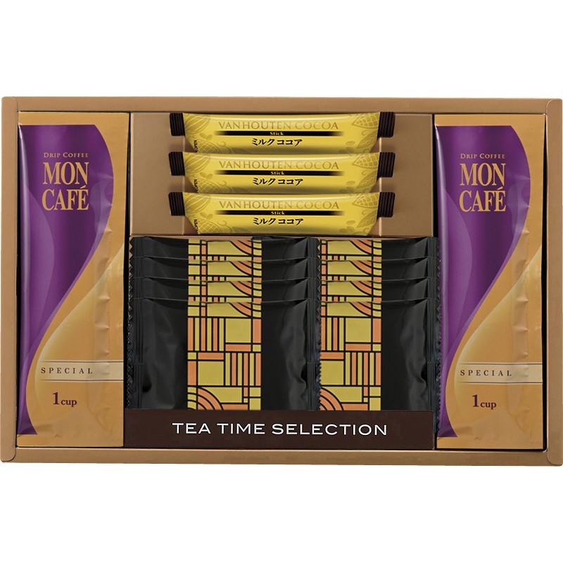 クッキー×8、モンカフェ ドリップコーヒー スペシャルブレンド(7.5g)×6、バンホーテン ミルクココア(18g)×3