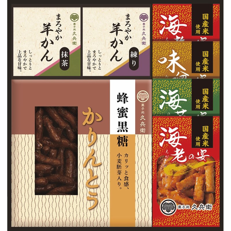 あられ(海老)(12g)×2、羊かん(抹茶・練り)(各60g)・蜂蜜黒糖かりんとう(40g)・あられ(海苔・味噌)(各12g)×各1