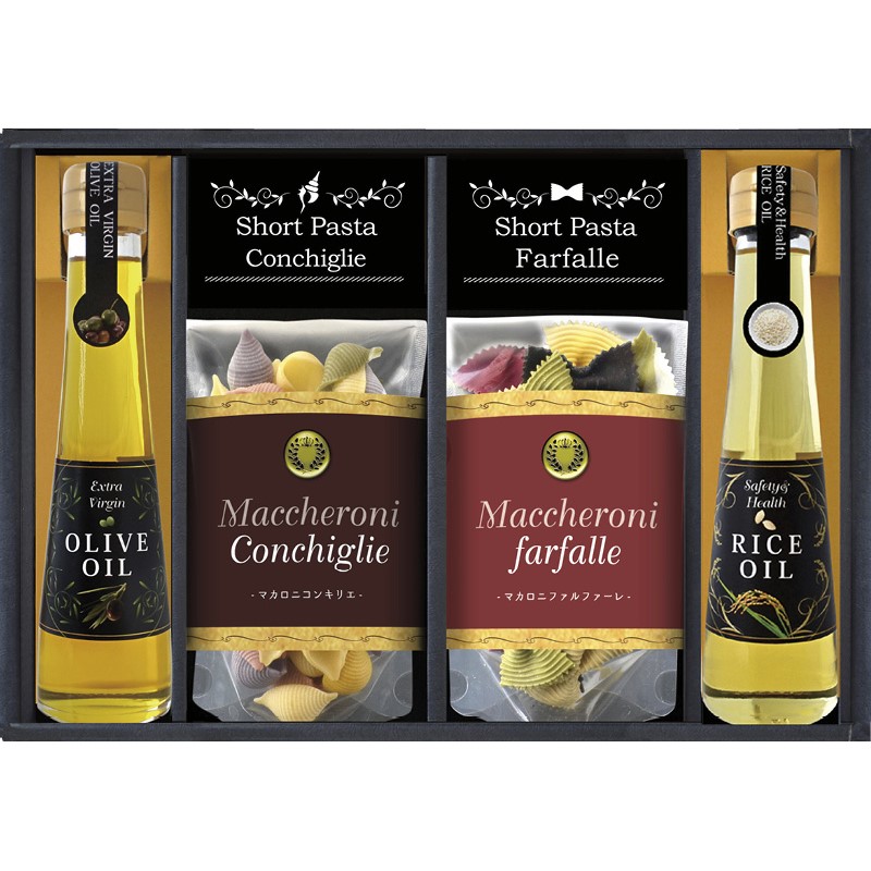 ライスオイル(110g)・エクストラバージンオリーブオイル(100g)・自然色パスタ(コンキリエ)(60g)・自然色パスタ(ファルファーレ)(40g)×各1