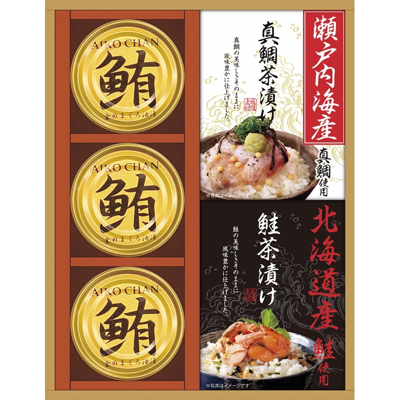 鮪油漬フレーク(70g)×3、瀬戸内海産真鯛茶漬け(5.1g×3袋)・北海道産鮭茶漬け(4g×3袋)×各1