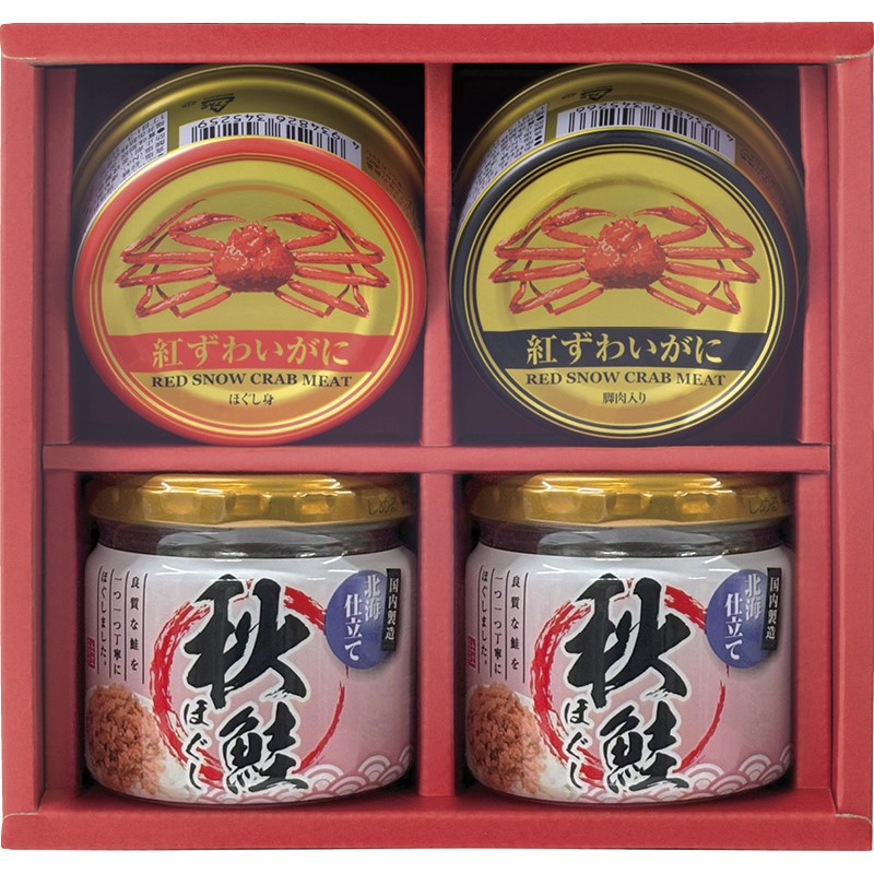 秋鮭ほぐし(50g)×2、紅ずわいがに(ほぐし身)・紅ずわいがに(脚肉入り)(各55g)×各1
