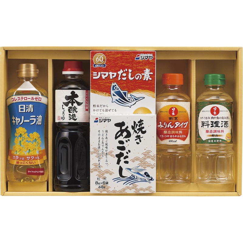 サンビシ本醸造しょうゆ(500ml)・日の出料理酒・日の出割烹みりんタイプ(各400ml)・日清キャノーラ油(350g)・シマヤだしの素粉末(10g×6袋)・シマヤ焼きあごだし(8g×6袋)×各1