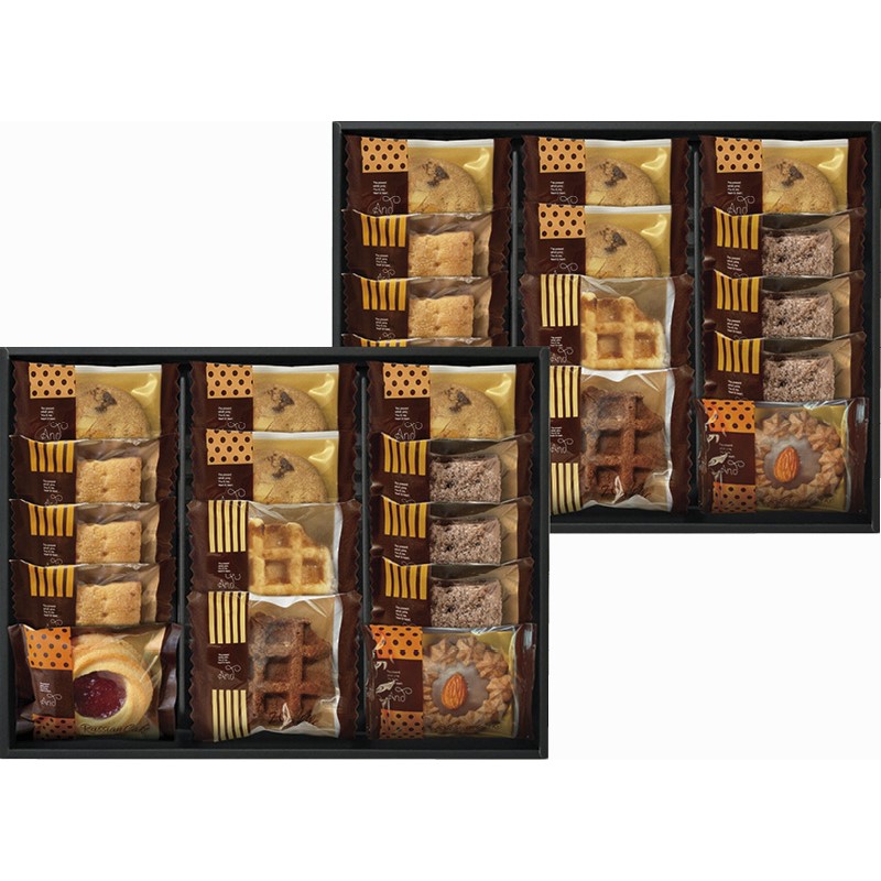 ナッツとチョコのざっくりクッキー×8、スクエアパイ(プレーン・ショコラ)×各6、ロシアケーキ(ブルーベリーサン・チョコアーモンド)・ワッフル(プレーン・チョコ)×各2