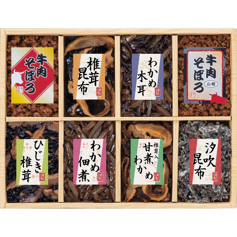 わかめ木耳(50g)・椎茸入甘煮わかめ(45g)・椎茸昆布・ひじき椎茸・わかめ佃煮・国産牛肉そぼろ・国産牛肉そぼろ(山椒)(各40g)・汐吹昆布(15g)×各1