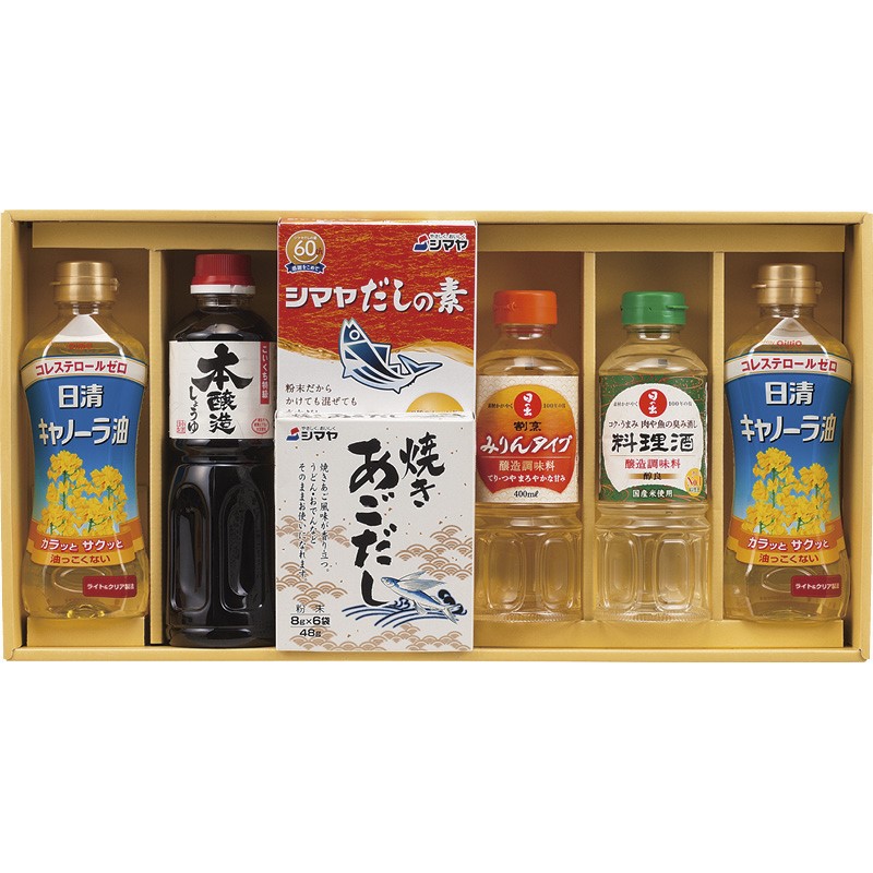 日清キャノーラ油(350g)×2、サンビシ本醸造しょうゆ(500ml)・日の出料理酒・日の出割烹みりんタイプ(各400ml)・シマヤだしの素粉末(10g×6袋)・シマヤ焼きあごだし(8g×6袋)×各1