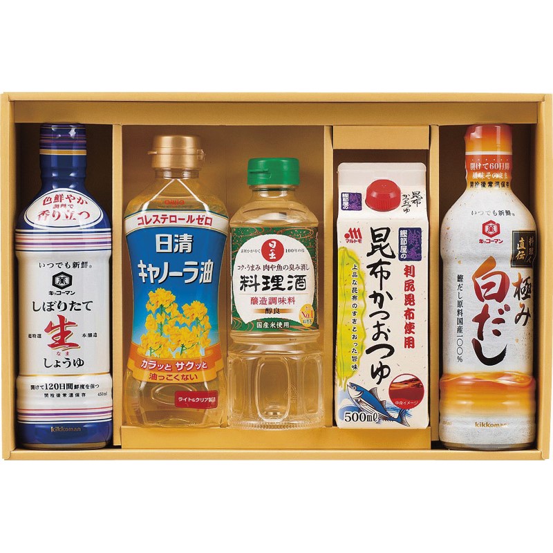 マルトモ昆布かつおつゆ(500ml)・キッコーマンいつでも新鮮(しぼりたて生しょうゆ・料理人直伝極み白だし)(各450ml)・日の出料理酒(400ml)・日清キャノーラ油(350g)×各1
