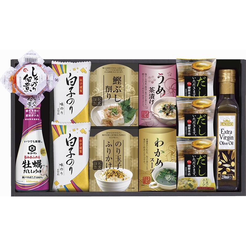 たまごスープ(5.4g)×3、白子味のり(8切5枚)×2、オリーブオイル(229g)・キッコーマン牡蠣だししょうゆ(200ml)・島の香しそのり佃煮(80g)・わかめスープ(5.3g×2袋)・のり玉子ふりかけ(4.5g×2袋)・うめ茶漬け(4.3g×2袋)・鰹ぶし削り(2g×3袋)×各1