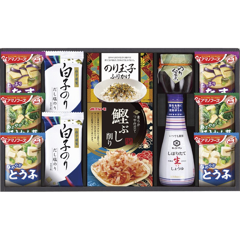 アマノおみそ汁(なす・ほうれん草・とうふ)・白子だし塩のり(8切5枚)×各2、キッコーマンしぼりたて生しょうゆ(200ml)・島の香のり佃煮(80g)・のり玉子ふりかけ(4.5g×2袋)・鰹ぶし削り(2g×4袋)×各1