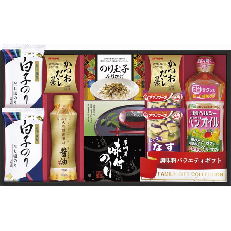 アマノなすおみそ汁(9.5g)・マルトモかつおだしの素(4g×4袋)・白子だし塩のり(8切5枚)×各2、日清ヘルシーベジオイル(600g)・伊賀越天然醸造しょうゆ(200ml)・のり玉子ふりかけ(4.5g×2袋)・有明海産味付のり(8切8枚×2袋)×各1