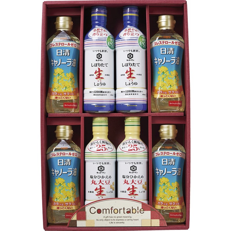 日清キャノーラ油(350g)×4、キッコーマン(しぼりたて生しょうゆ・塩分ひかえめ丸大豆生しょうゆ)(各450ml)×各2