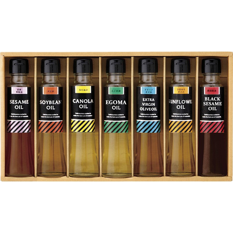 胡麻香味油・大豆油・なたね油・えごま油・エキストラヴァージンオリーブオイル・ひまわり油・黒胡麻油(各90g)×各1