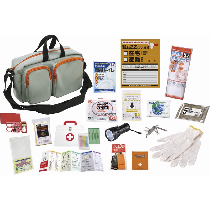 収納ショルダーバッグ(27×13×17.5cm)・ホイッスル・ウェットティッシュ・マスク・軍手・アルミブランケット・防災の心得・懐中電灯・給水袋(3L)・カイロ・レインコート・抗菌消臭簡易トイレ・8徳ナイフ・ソーイングセット・緊急避難カード・水に流せるペーパー・救急4点セット×各1★懐中電灯:単1または単3乾電池1本使用(別売) ★絆創膏医療機器届出番号:27B3X00138000001