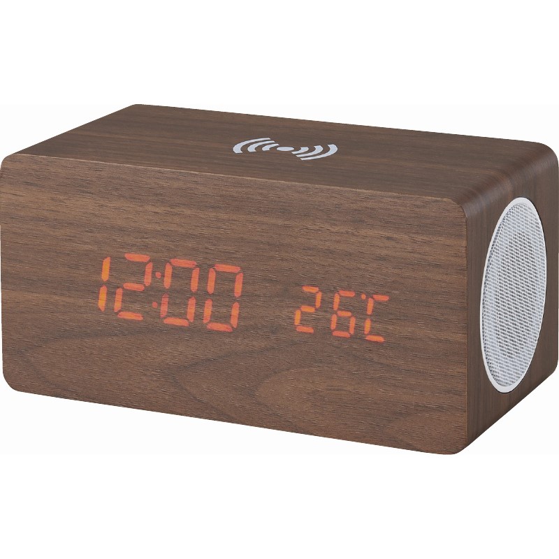 ブルートゥーススピーカー、Qi対応ワイヤレス充電器、時計、温度計、カレンダーが一体化。アラームは3種設定可能。時計表示は常時点灯の他、振動センサーで必要な時だけ点灯も設定可能。 機能:ブルートゥーススピーカー、ワイヤレス充電、時計、温度計、カレンダー、アラーム(3個)、音・振動センサー