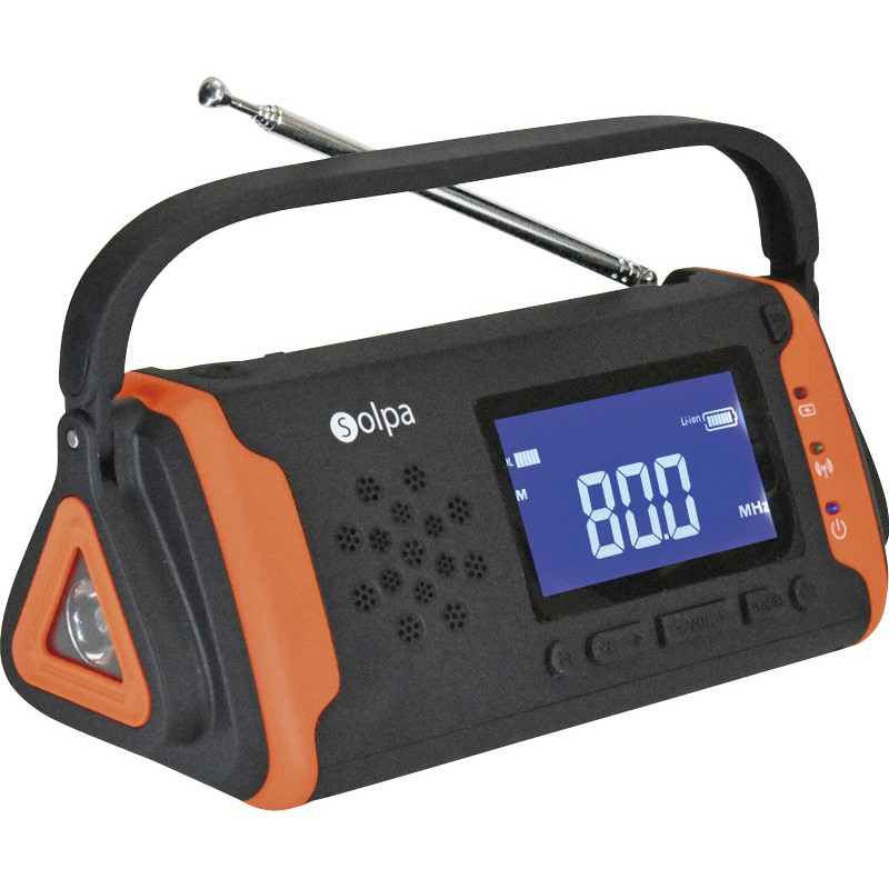 4WAY充電の便利さ! ハンドルを回す「手回し充電」、本体に搭載したソーラーパネルからの「ソーラー充電」、乾電池からの充電、PC等からのUSB充電に対応しています。大容量4000mAhのバッテリー内蔵。スマートフォン充電も安心。ラジオ、懐中電灯、SOSアラームと機能満載。付属ケーブルを接続しオーディオ機器のスピーカーとして使用出来ます。