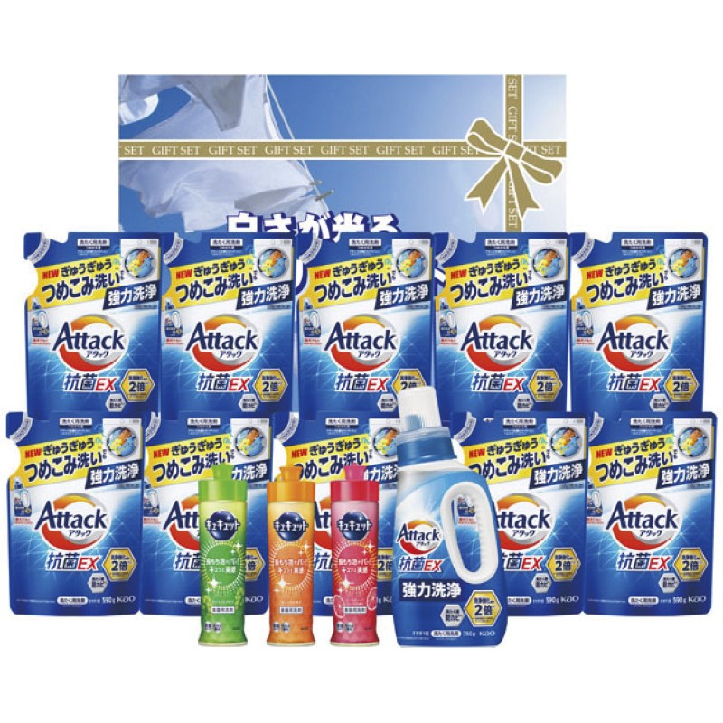 アタック抗菌EX詰替用(590g)×10、アタック抗菌EX(750g)・キュキュット(オレンジ・ピンクグレープフルーツ・マスカット)(各220ml)×各1