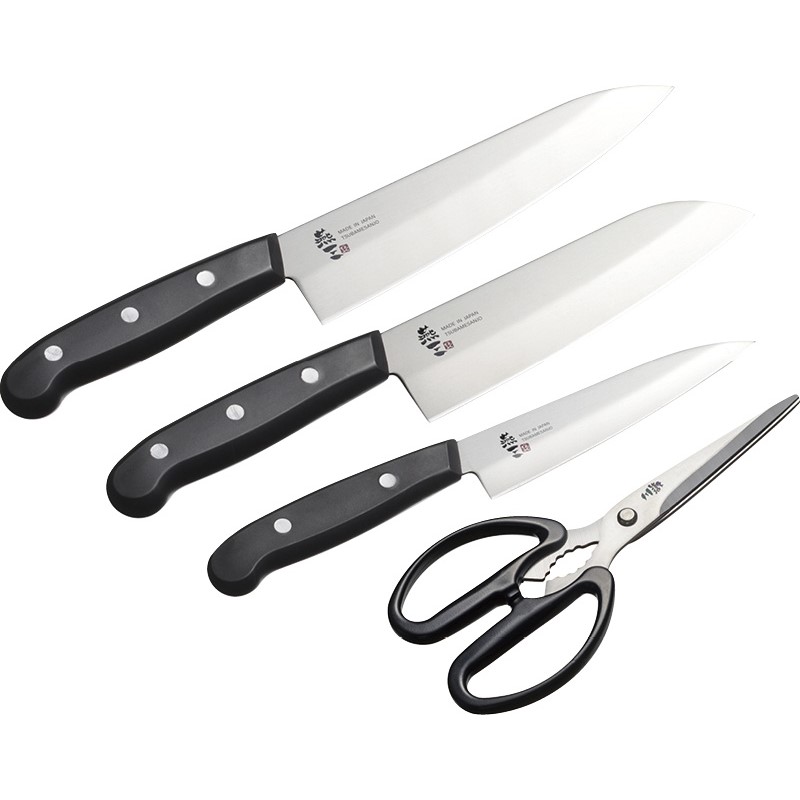 牛刀包丁(30cm、刃渡り18cm)・三徳包丁(28.5cm、刃渡り16.5cm)・ペティナイフ(24cm、刃渡り13cm)・キッチンハサミ(約19cm)×各1
